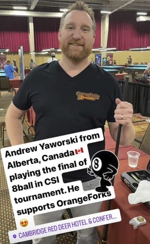 Yaworski’s practice paid off and his pool playing career has met multiple instances of success. In 2022, Andrew won the CSI Western Canadian Championships 8-Ball Singles in the Platinum Division. That same year, he took second place in the CSI Western Canadian Championships 10-Ball Singles.