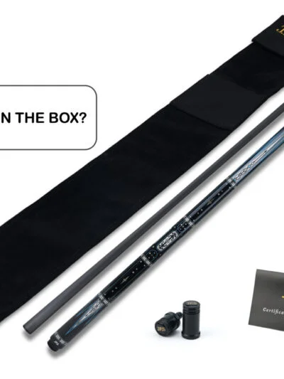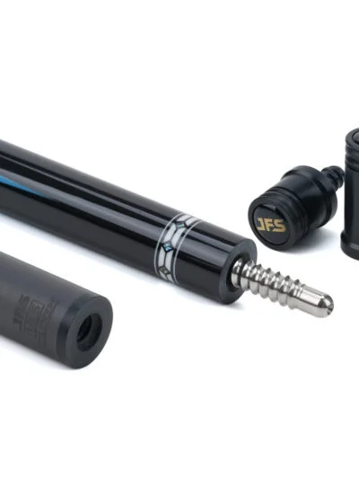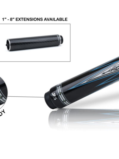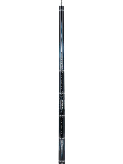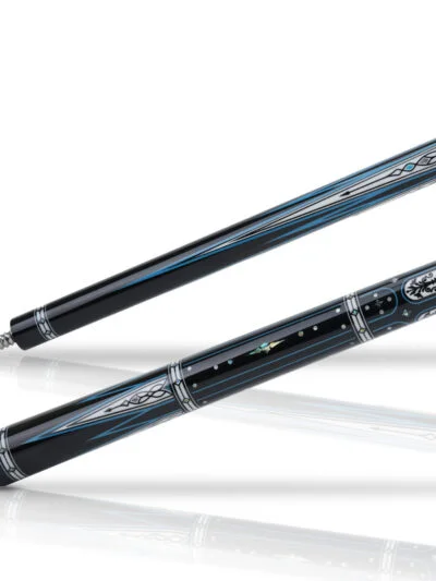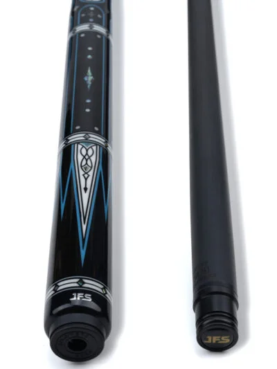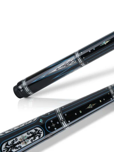 Ebony with fireworks. JF40‑19 stages tons of abalone, mother‑of‑pearl dots, and blue maple‑outlined JUMA pointwork—offered wrapless for uninterrupted art or with a black elephant‑ear embossed leather double‑stack for patterned traction.