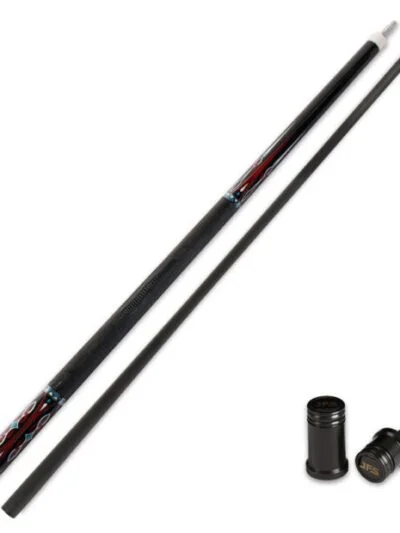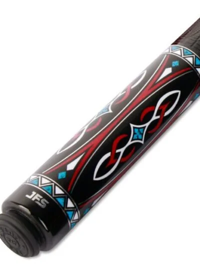 Royal flash, leather grip. Calcutta 2 puts deep red, azure, and white over black‑painted maple—armed with the Calcutta javelin/dagger forearm and a playing‑card‑robes butt sleeve—finished in an embossed black “lizard” genuine leather wrap for confident traction.