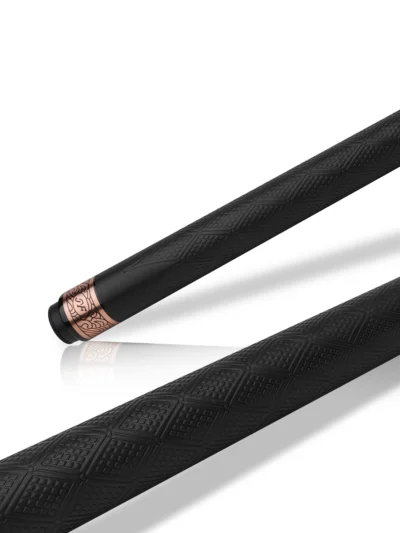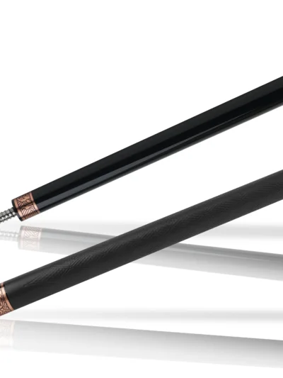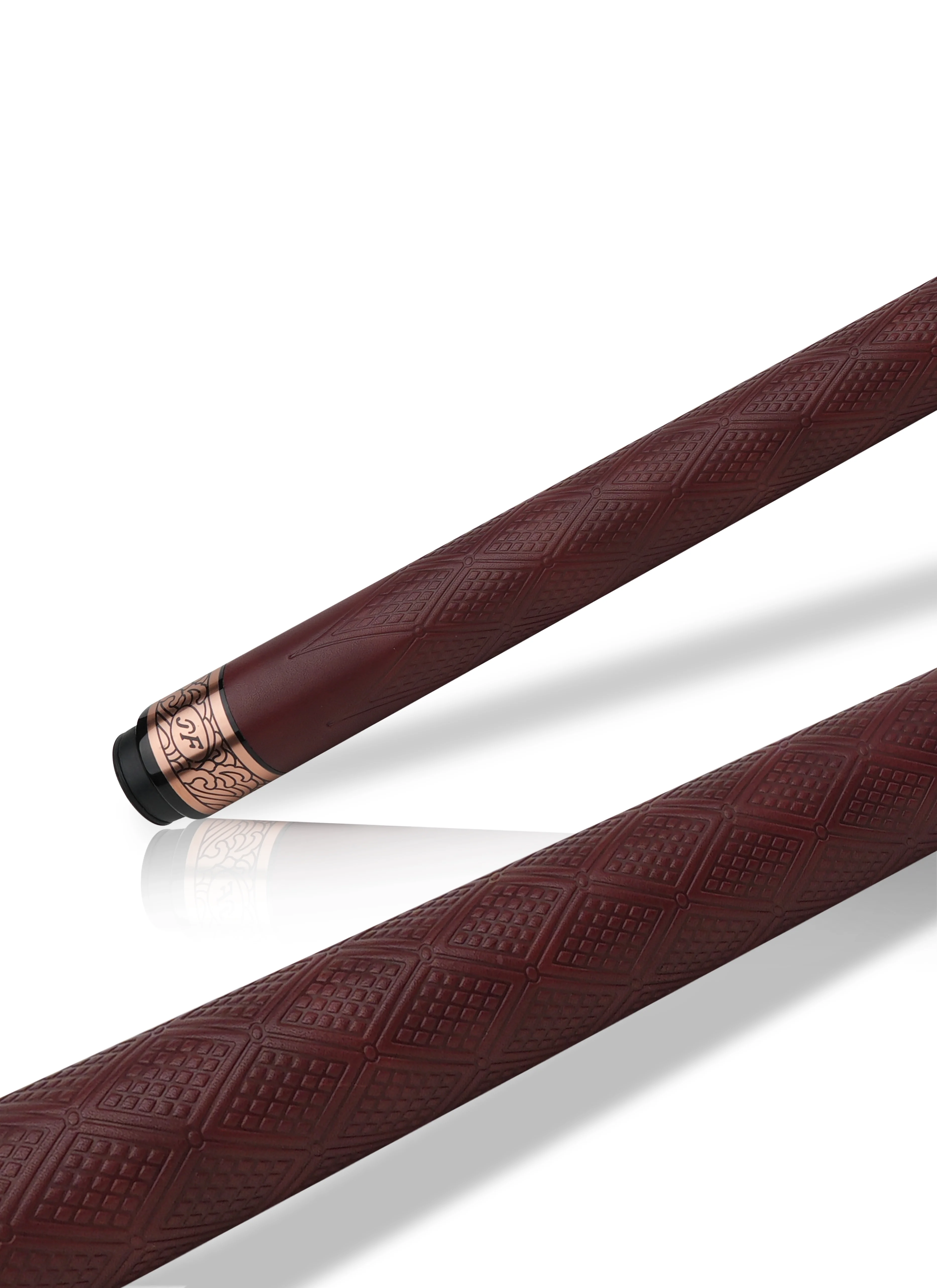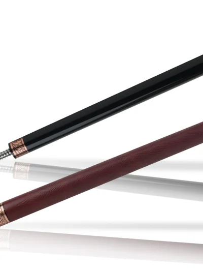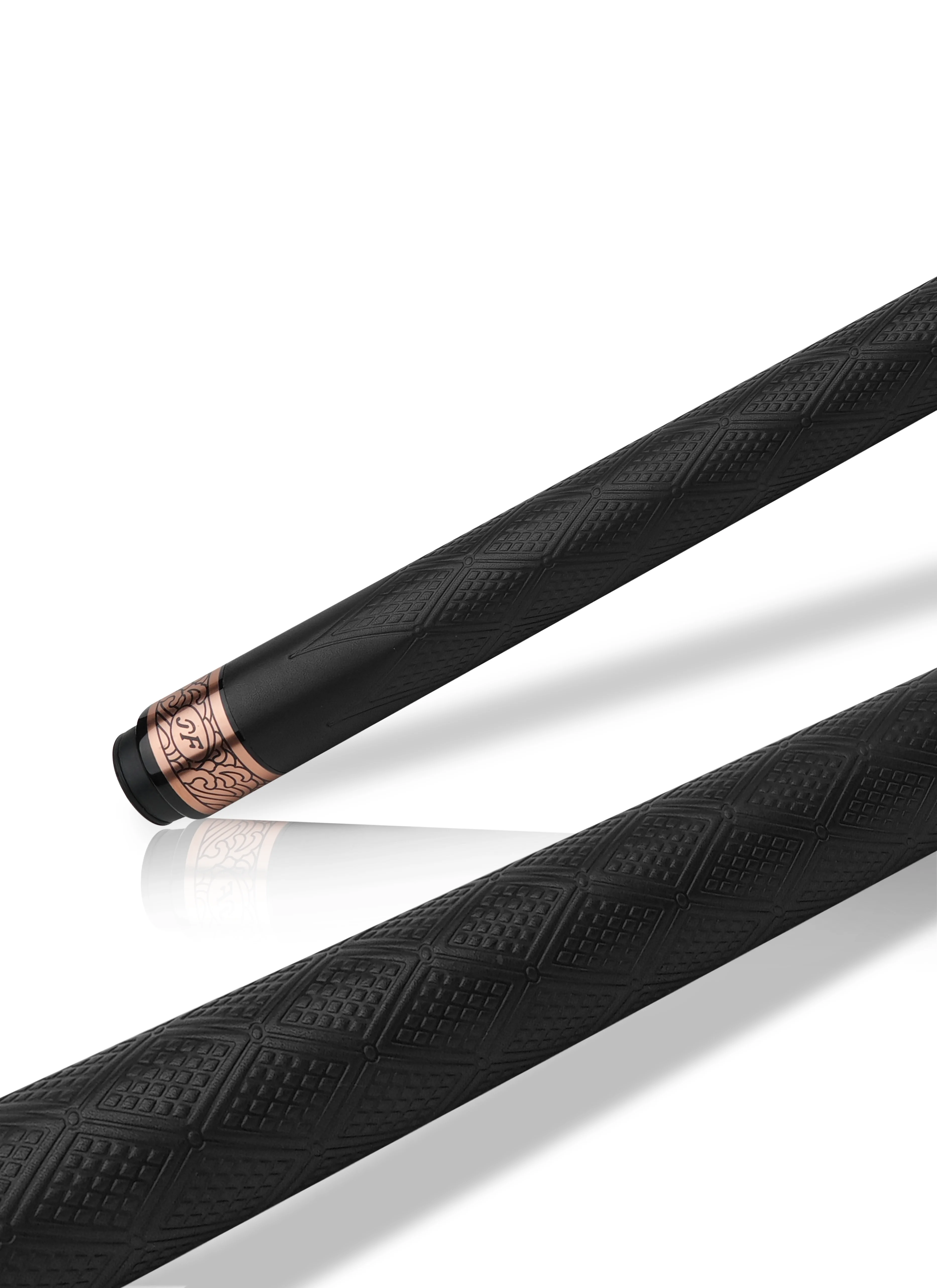 Black suit, brass accents. A black‑painted maple body dressed with wide brass ringwork, brass joint collar & butt cap, and a diamond‑pattern embossed leather wrap in black or rust red. Built on our Classic carbon‑fiber foundation—then you tailor diameter, weight, and upgrades to match your stroke.