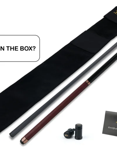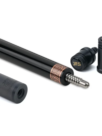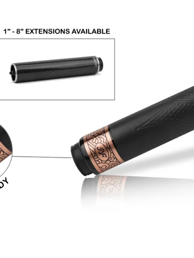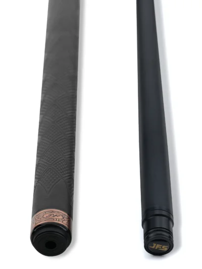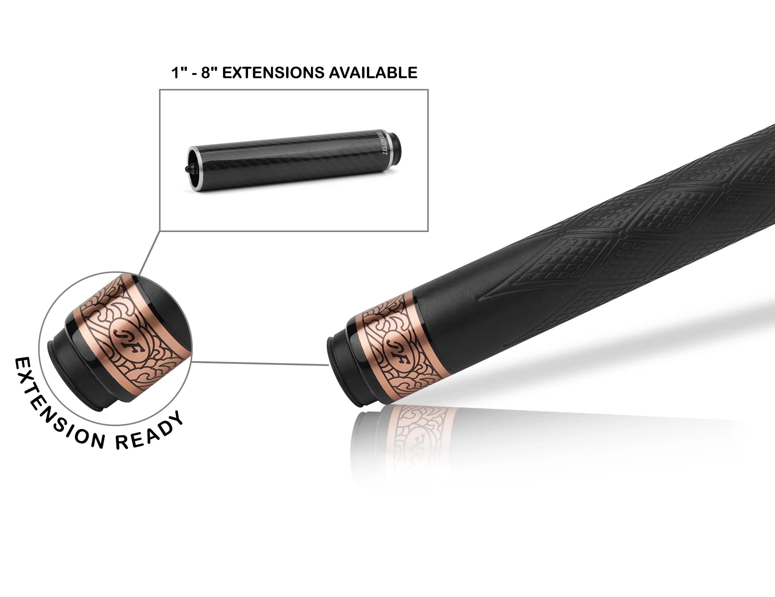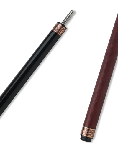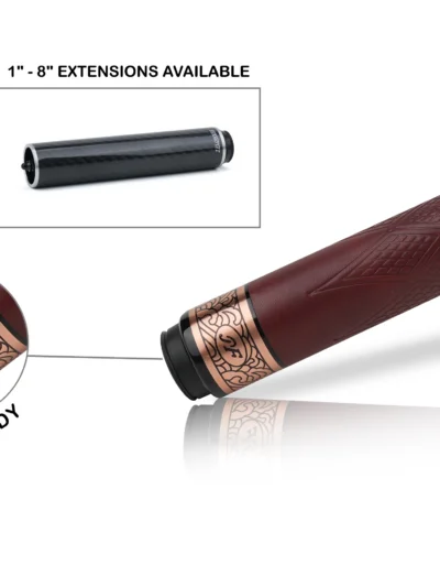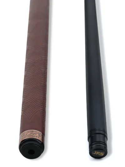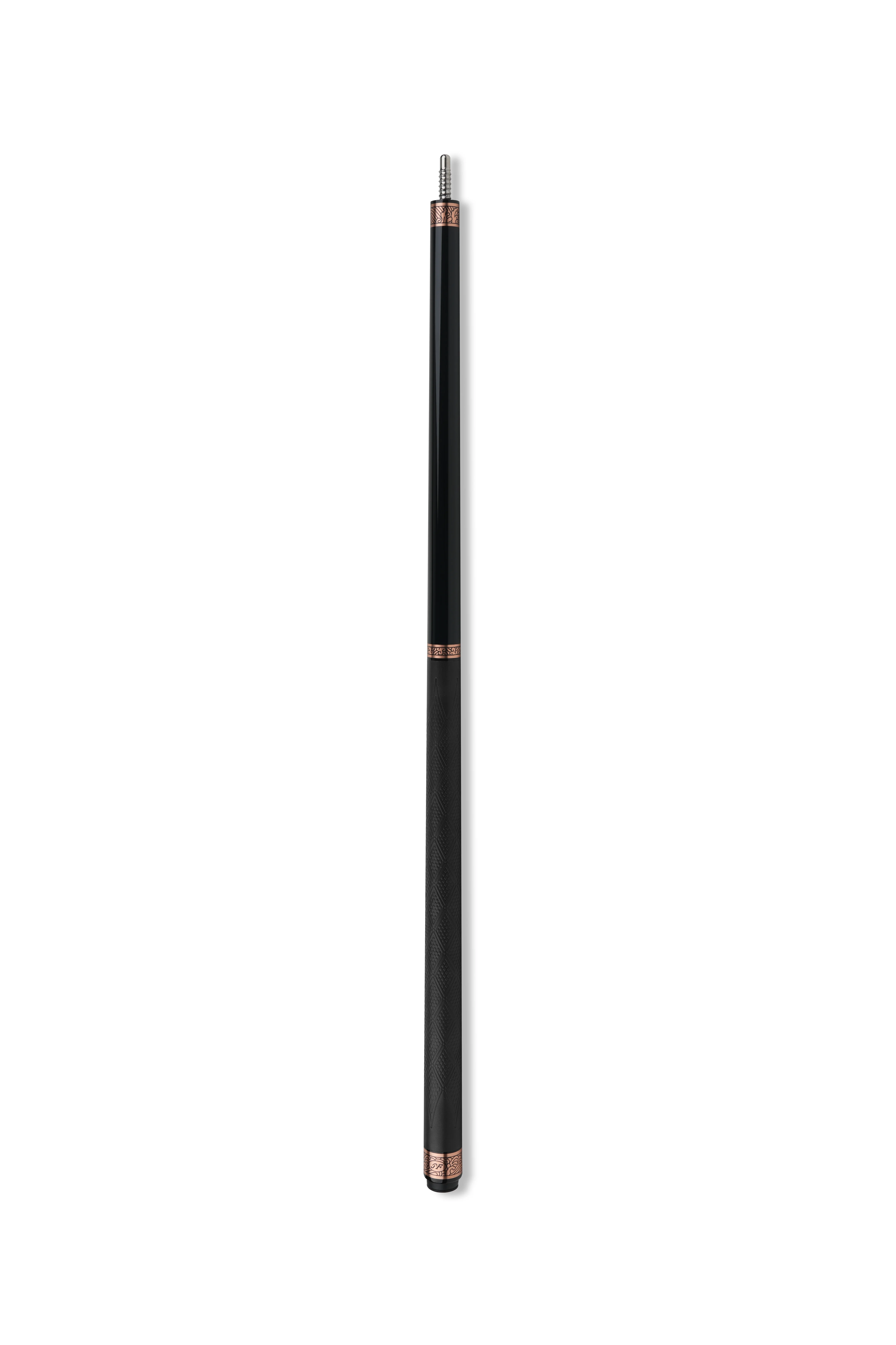 Black suit, brass accents. A black‑painted maple body dressed with wide brass ringwork, brass joint collar & butt cap, and a diamond‑pattern embossed leather wrap in black or rust red. Built on our Classic carbon‑fiber foundation—then you tailor diameter, weight, and upgrades to match your stroke.