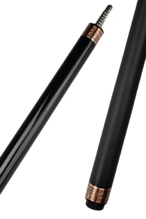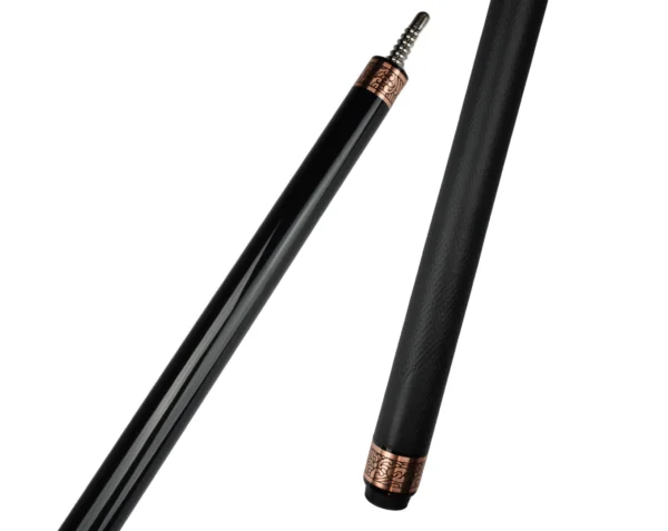 Black suit, brass accents. A black‑painted maple body dressed with wide brass ringwork, brass joint collar & butt cap, and a diamond‑pattern embossed leather wrap in black or rust red. Built on our Classic carbon‑fiber foundation—then you tailor diameter, weight, and upgrades to match your stroke.