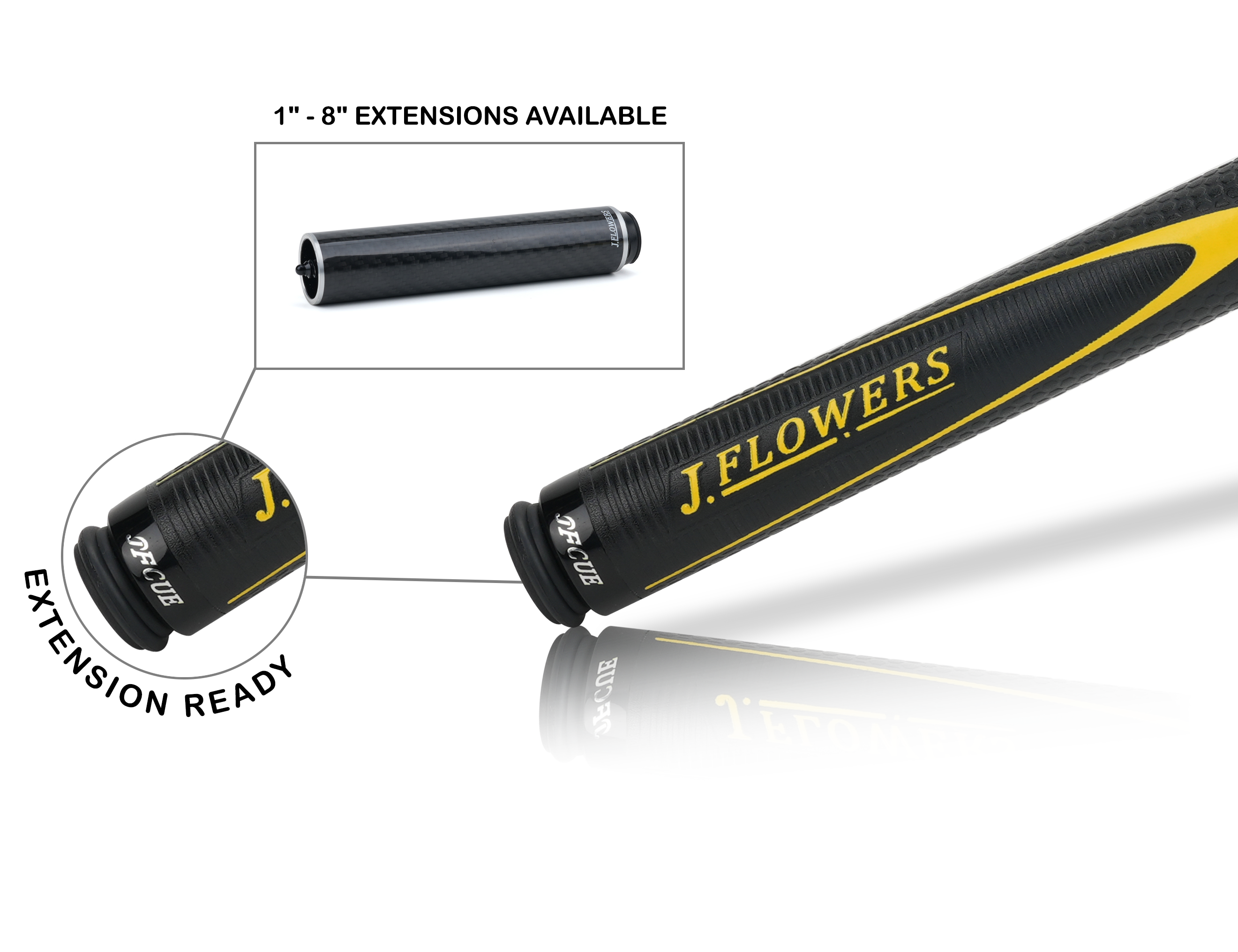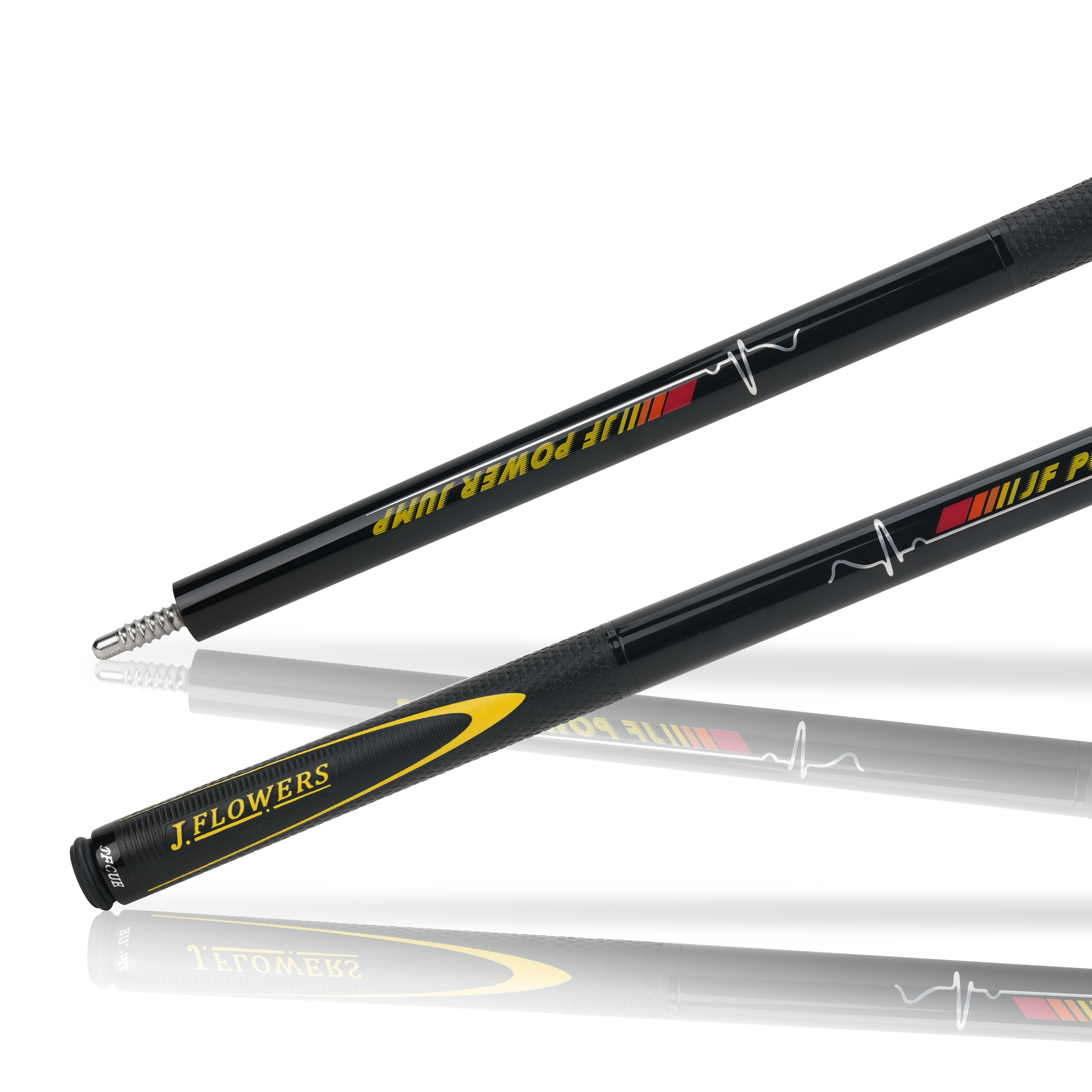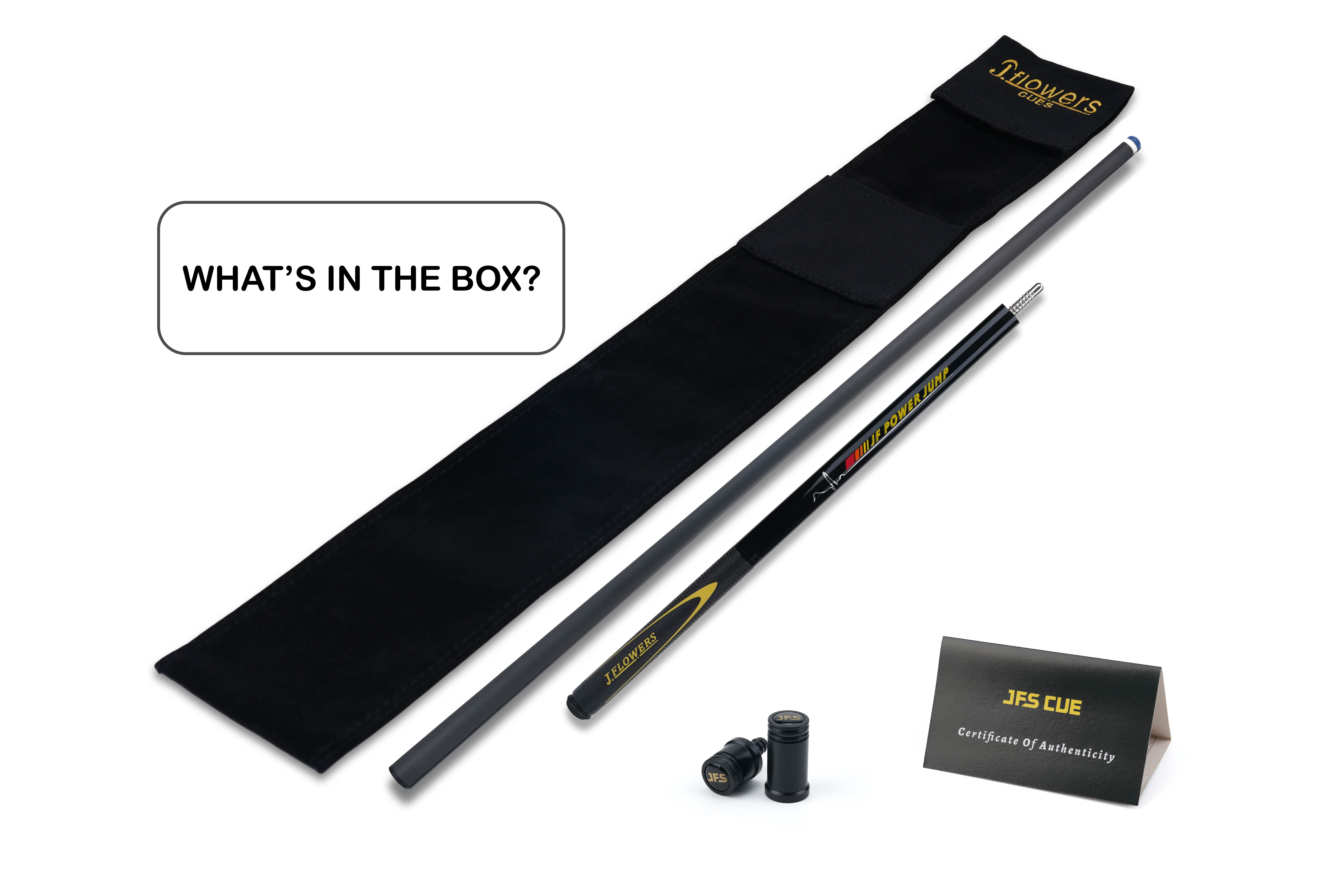 Pop it up, park it close. JF‑JP2 is a light, purpose‑built jump cue with a ≈13.8 mm phenolic contact, a stiff, jump‑tuned carbon platform, and an ash butt wearing a bold yellow JF Power Jump motif and extended leather sport wrap for secure acceleration. Quick worldwide shipping. Order now.