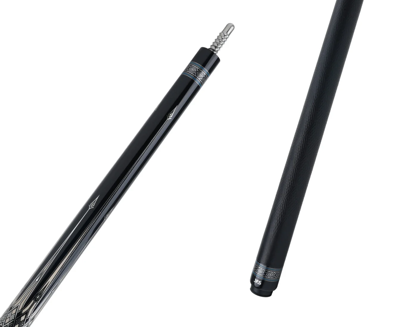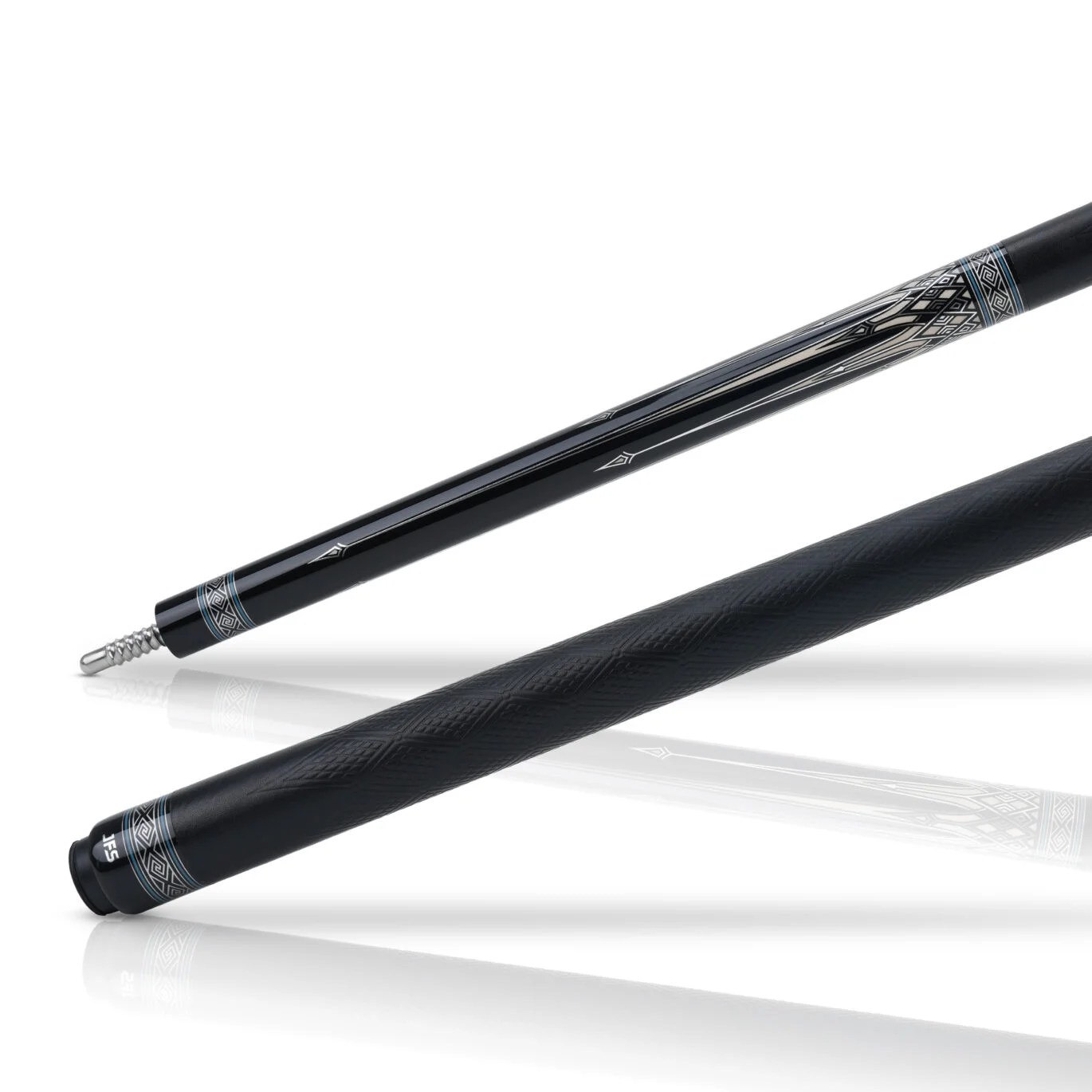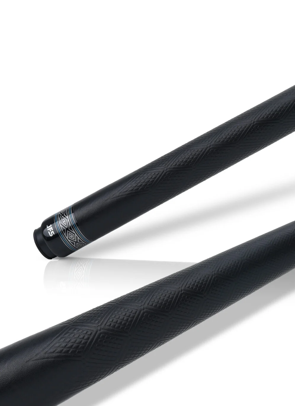 Two personalities, one cue. The wrapless version carries the forearm’s black‑painted maple and Silver arrow overlay theme straight through the grip and butt sleeve—clean, fast, and visually seamless. The wrap version swaps that for an extended diamond‑pattern embossed black leather handle that brings a textured hold and a classic profile.