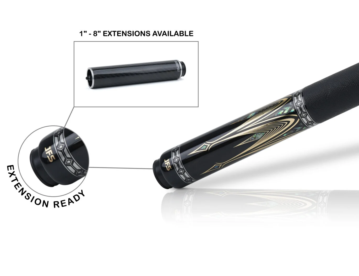A: Yes—this cue ships with an extension‑ready bumper. You can add JFlowers 1, 2, 3, 5, 6, or 8‑inch extensions for extra reach. Did you know our extensions are stackable to achieve your desired length?