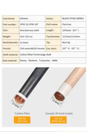 A stunning design of the pool cue in the Black Sting Series. The JF90-12 has real inlays. Carbon fiber shaft included. Quick worldwide shipping. Order yours today.
