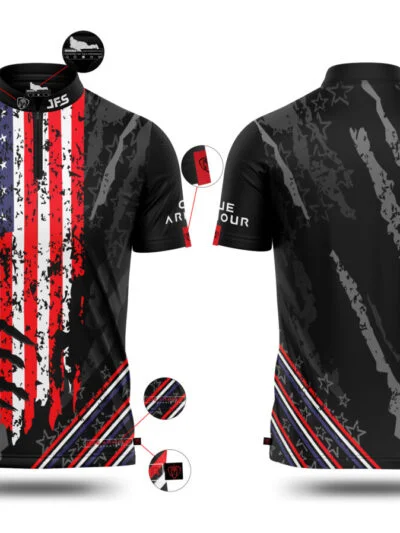Presenting our Patriot USA jersey with a sport collar, the premier selection for top-tier pool and cue sports apparel. Meticulously crafted from an ultra-lightweight premium performance blend, it is engineered to maintain its integrity wash after wash while offering superior breathability, unmatched stretch, and vibrant color retention.